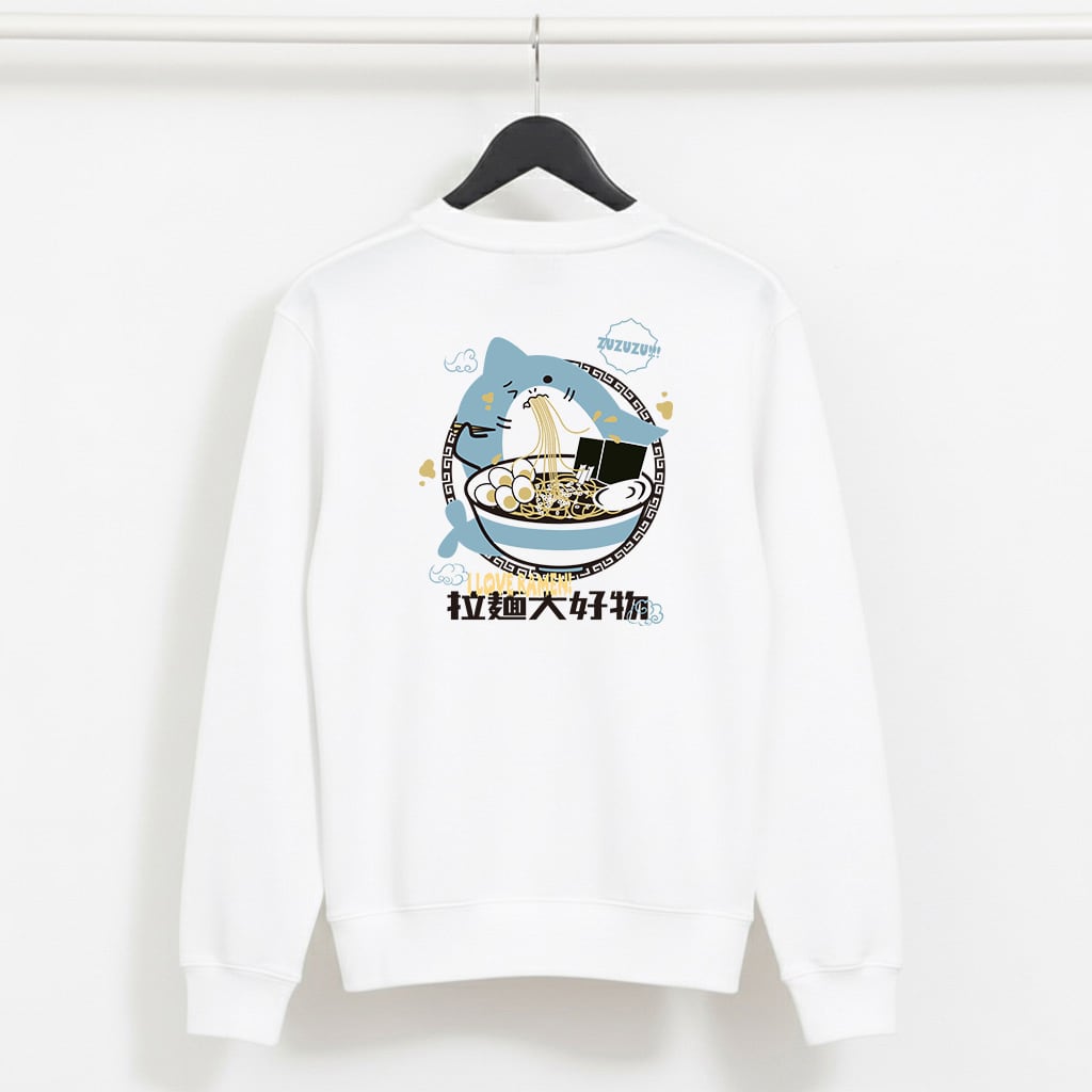 ラーメンをすするサメが背中に!裏起毛であったか。
